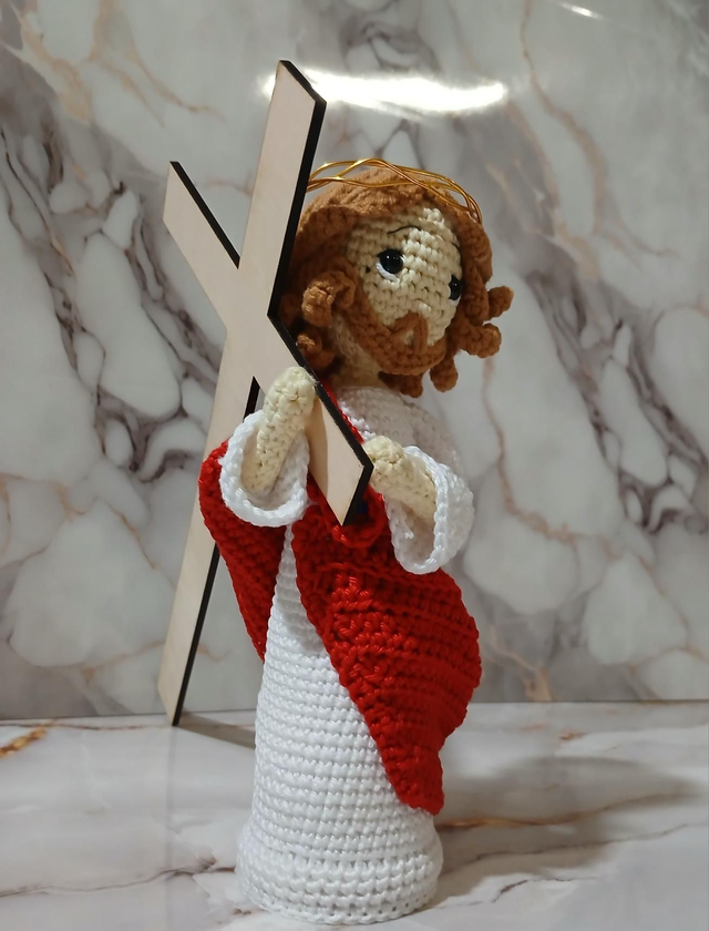 - Matériaux : Fil de coton doux et de qualité de couleur rouge et blanc, yeux de sécurité, couronne d'épines en fil doré, croix en bois